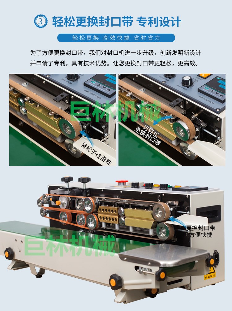 本機(jī)是新一代集印碼,封口,連續(xù)輸送為一體的自動薄膜封口機(jī),具有印字清晰、顔色可選、即印即干、換字方便等特點(diǎn)。
