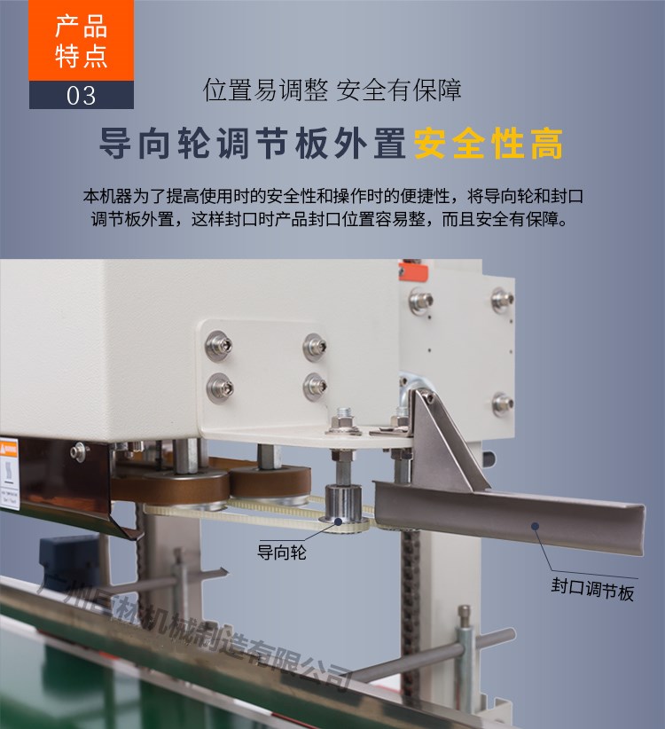 7包裝物進入輸送臺時必須貼著護欄,包裝袋口一旦被引導帶拖入后,輸送帶與封口傳動同步進行封口包裝,此時請不要對包裝物任意推動或阻擋,以免造成封口效果不良。